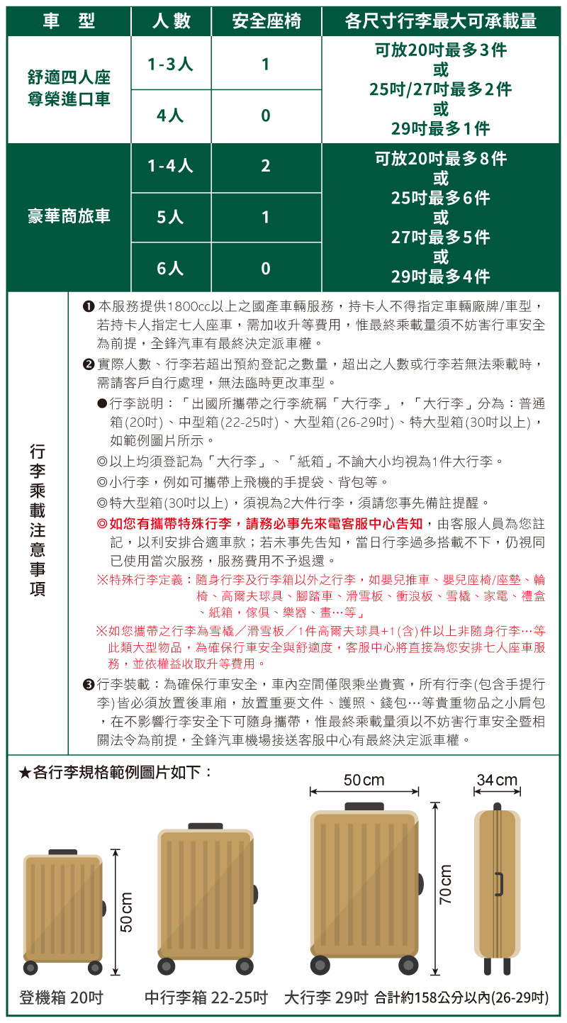 - 乘載人數&行李件數&安全座椅 (詳見【乘載人數/行李件數說明】),「全鋒汽車」有最終決定派車權。