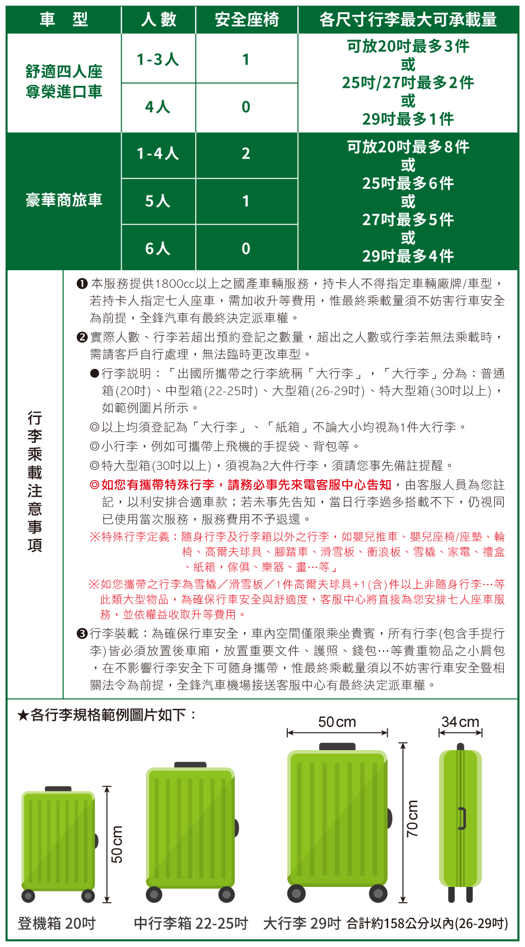 接送車種可選擇1800 C.C.車型、2000 C.C.車型、LEXUS、賓士、或其他7人座車型,惟因各車款能承載之人數及行李大小有限,為確保搭乘貴賓之旅途安全,請持卡人於預約時主動告知欲搭乘人數、行李大小及數量,惟最終承載量須以不妨害行車安全為前提,「全鋒汽車」有最終派車決定權。