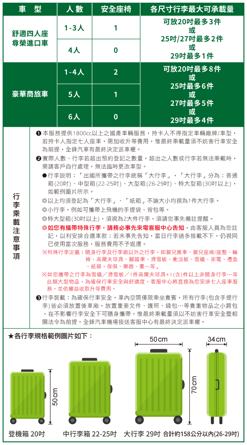 (b) 行李限制及承載人數等相關注意事項,請詳閱「乘載人數/行李件數說明」,如遇承載行李超出車輛可承載範圍而影響行車安全,「全鋒汽車」將有權拒絕載運。
